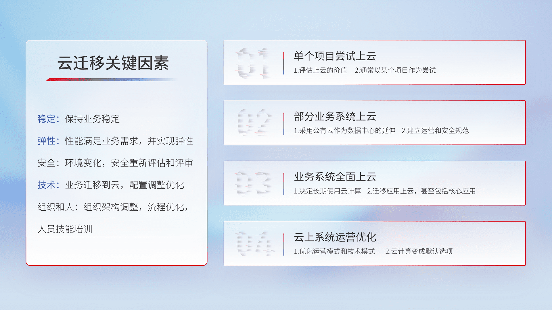 结合实际业务,,,从规划设计、、、、云平台选型、、云原生改造、、、、数据迁移、、、集成交付,,迁移全过程为客户识别最佳上云路径,,,做好风险识别管理,,,设计网络架构、、、、身份权限、、、安全审计合规、、操作审计、、、、日志审计、、监控告警策略、、、多站点容灾设计等,,,,对云上基础设施进行整体规划,,提升IT治理水平,,,,以满足弹性、、高可用、、高性能的需求。。