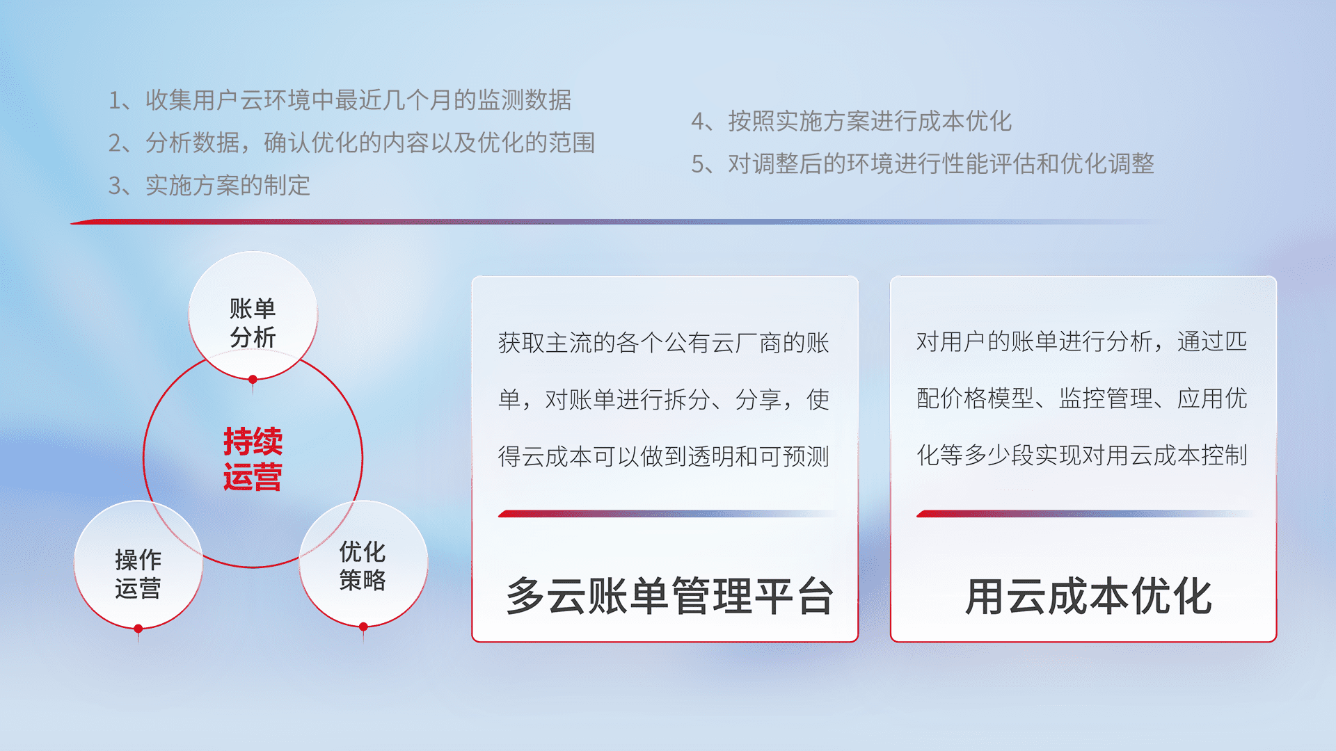 通过多云纳管,,,以统一的资源数据模型把客户的云资源进行抽象和封装,,,,进而实现对多云资源的统一操作,,保障云资源管理的可靠性、、、稳定性与可用性。。量身定制化运维内容,,,配置、、开发运维、、补丁管理、、备份、、、监控、、、、认证和访问管理、、、审计和日常巡检等,,保障在用云过程中的可靠度,,,稳定度以及高可用率。。。。