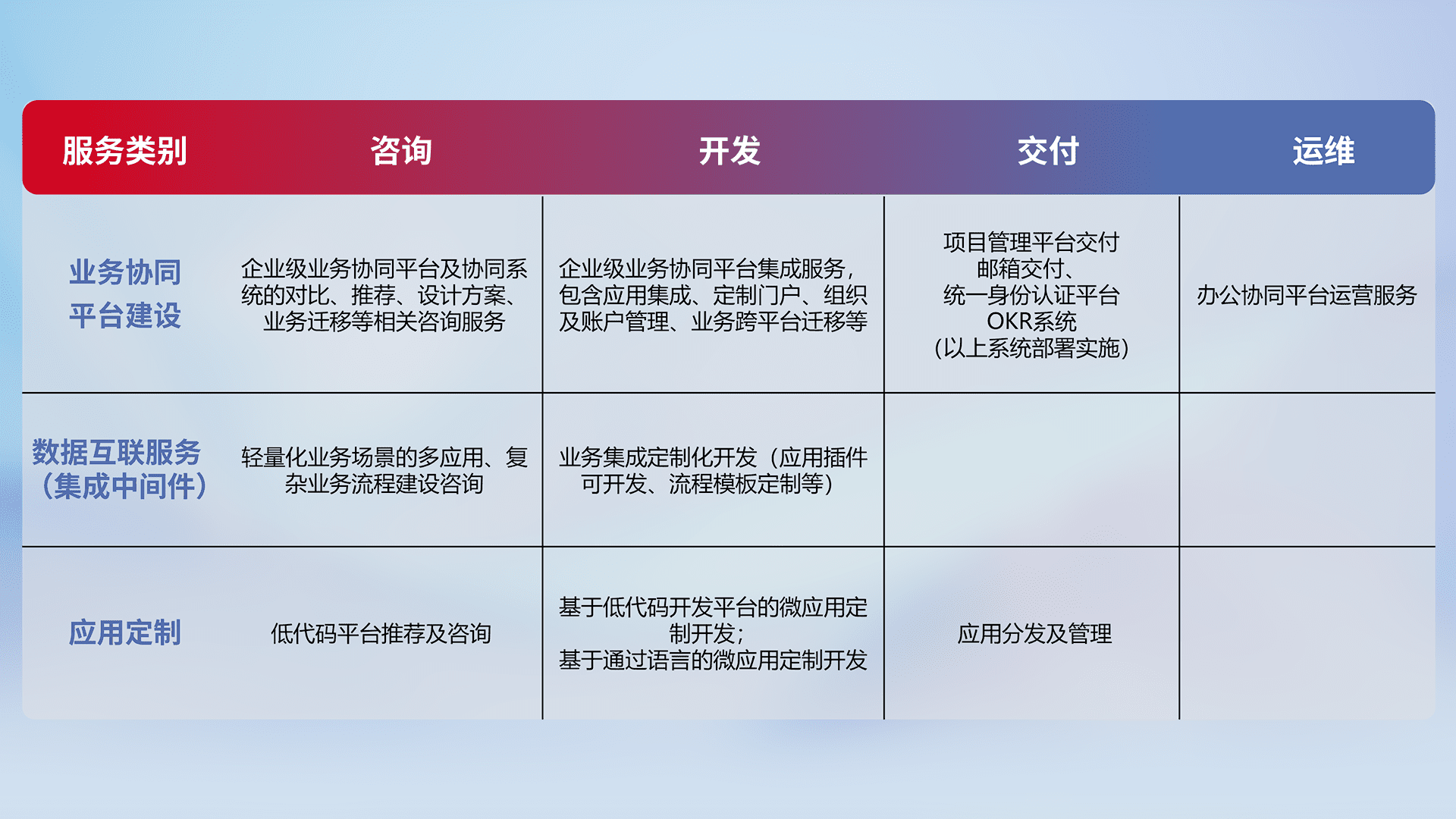 针对钉钉、、、企微、、、IDaas等平台级产品提供产品的规划、、、、方案、、交付、、、定制化开发等服务,,实现如统一协同办公、、智能客户服务、、混合会议管理、、、、智能数据查询、、、等业务场景,,,,实现数字化转型。。。。